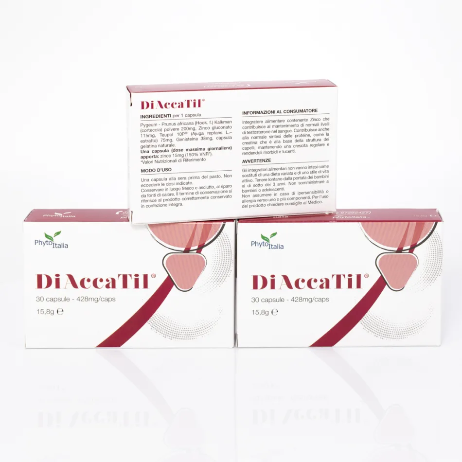 DIACCATIL® ( per 1 cps):Prunus africana (Hook.f) Kalkman (corteccia) polvere 200 mg, Zinco gluconato 115 mg, Teupol 10P® (Ajuga reptansL.-estratto) 75 mg., Genisteina 38 mg, capsula gelatina naturale 1 capsula ( dose massima giornaliera) apporta: zinco 15 mg (150%VNR*) *Valori Nutrizionali di Riferimento
