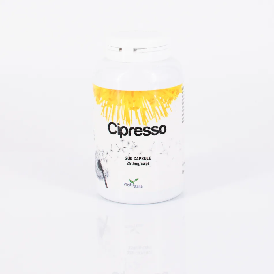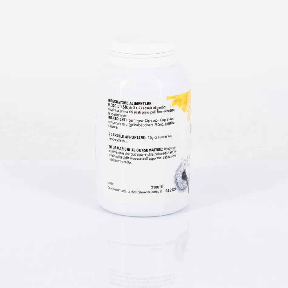 CIPRESSO (per 1 cps): Cipresso - Cupressus sempervirens L. (galbulo) polvere 250mg, gelatina naturale. 6 CAPSULE APPORTANO: 1,5g di Cupressus sempervirens L.