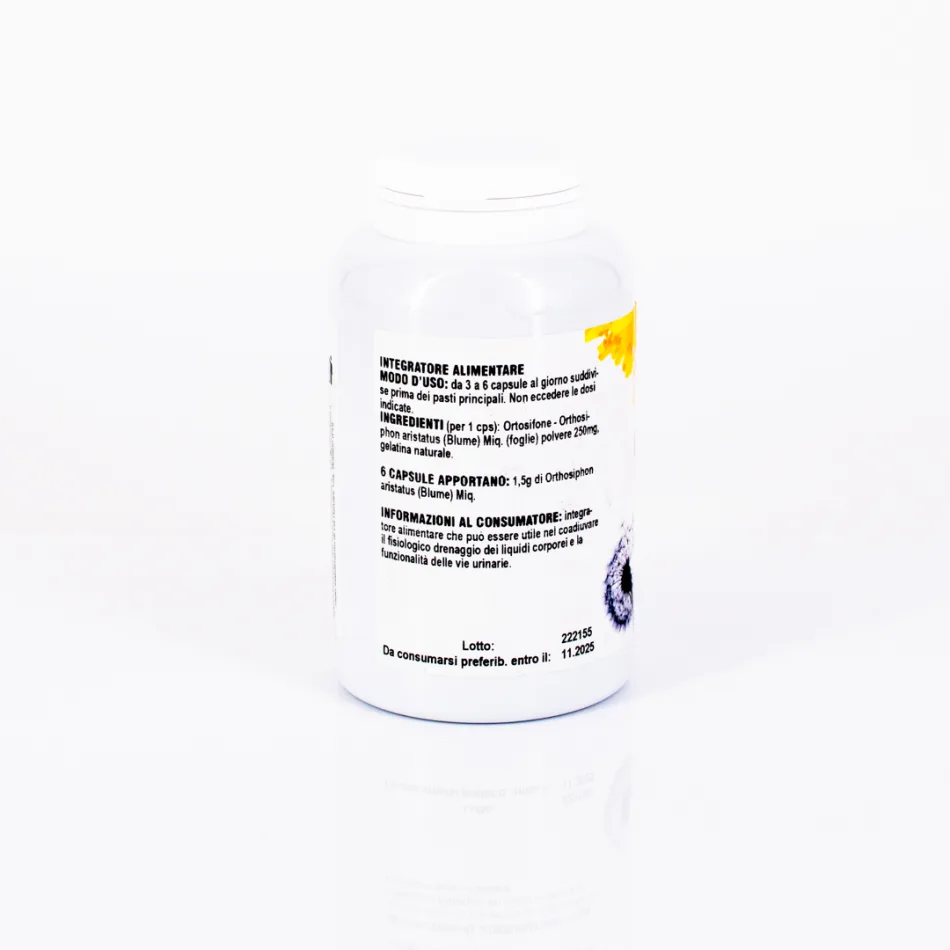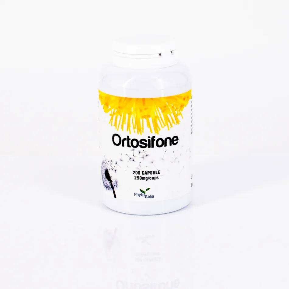 ORTOSIFONE (per 1 cps): Ortosifone - Orthosiphon aristatus (Blume) Miq. (foglie) polvere 250mg, gelatina naturale. 6 CAPSULE APPORTANO: 1,5g di Orthosiphon aristatus (Blume) Miq.