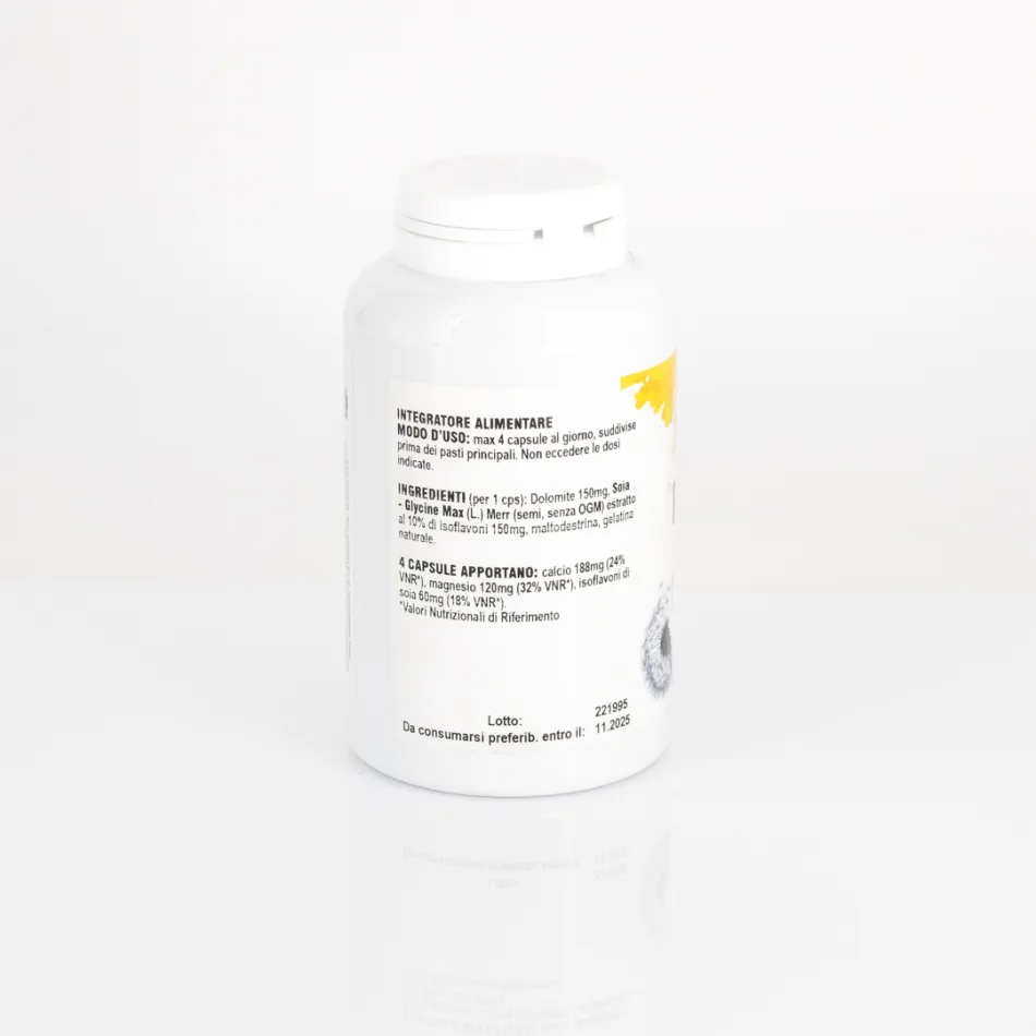 4 CAPSULE APPORTANO: calcio 188mg (24% VNR*), magnesio 120mg (32% VNR*), isoflavoni di soia 60mg (18% VNR*).*Valori Nutrizionali di Riferimento