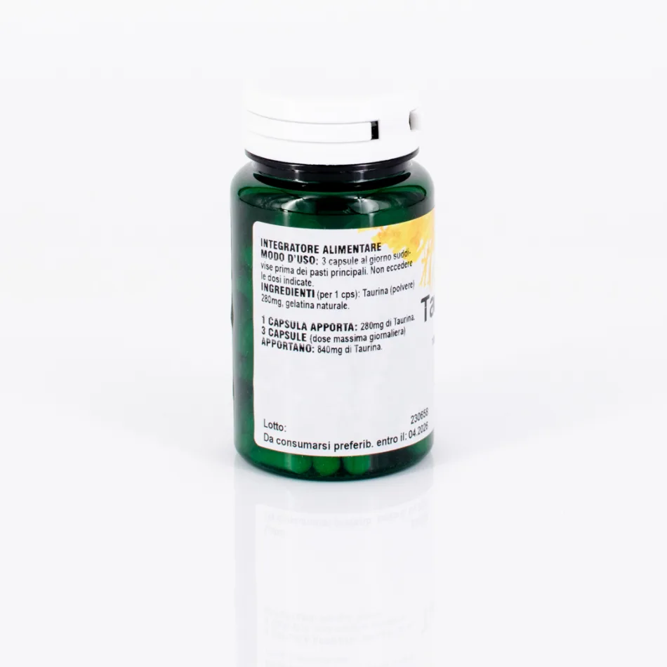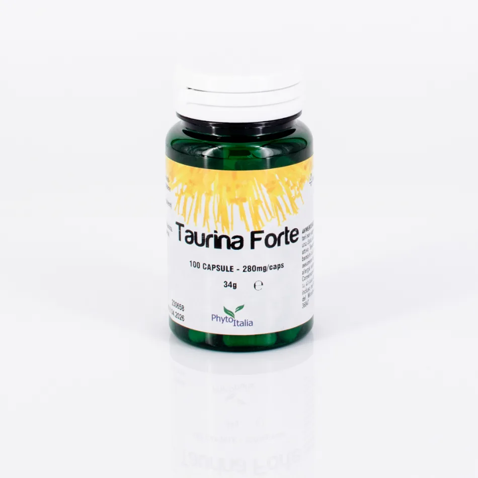 TAURINA FORTE (per 1 cps): Taurina (polvere) 280mg, gelatina naturale. 1 CAPSULA APPORTA: 280mg Taurina. 6 CAPSULE APPORTANO: 840mg di Taurina.