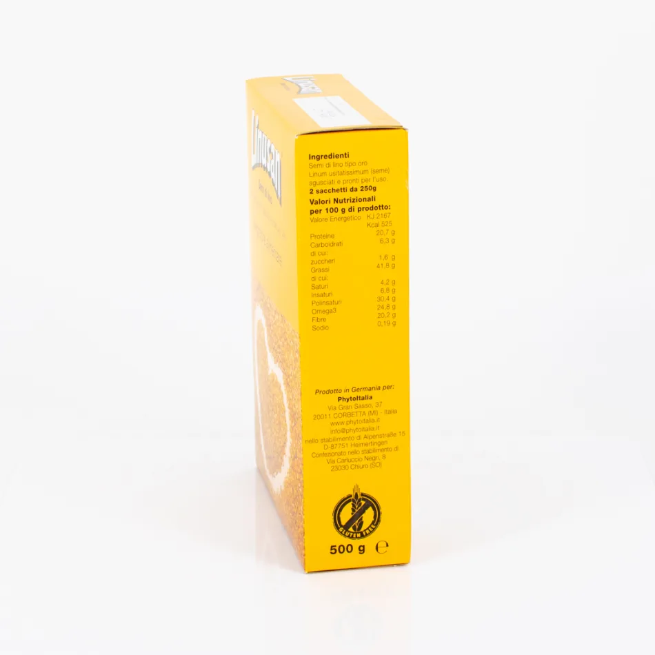 Semi di lino tipo oro sgusciati e pronti per l'uso. Lino - Linum usitatissimum L. (seme). 3 CUCCHIAI (circa 5 gr) APPORTANO: 1g di fibre, 1,24g di Omega3 (ALA) VALORI NUTRIZIONALI PER 100g DI PRODOTTO:Valore energetico Kcal 525 Proteine 20,7 g Grassi 41,8g : saturi 4,2 g, insaturi 6,8 g, polinsaturi 30,4g Carboidrati 6,3 g (di cui zuccheri 1,6 g) Omega3 24,8 g Fibre 20,2 g Sodio 0,19 g