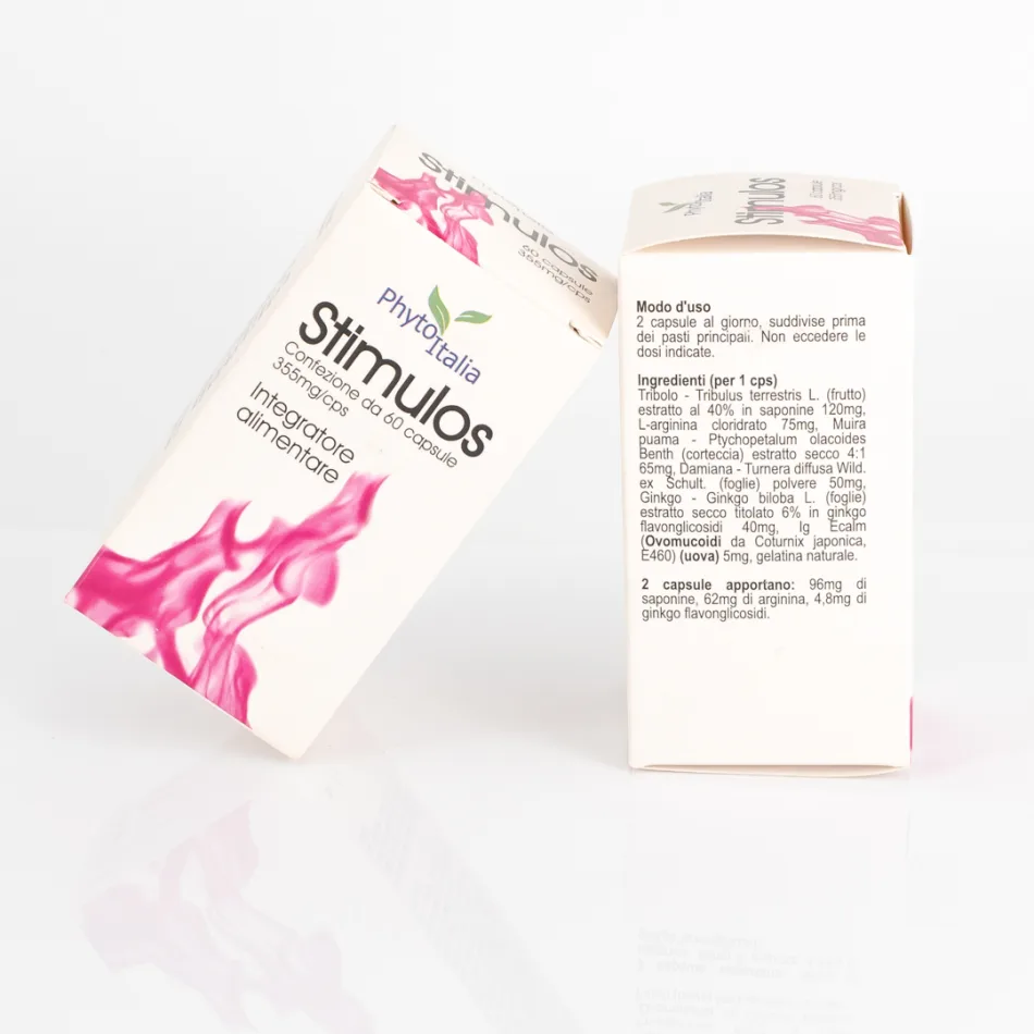 STIMULOS (per 1 cps): Tribulus - Tribulus terrestris L. (frutto) estratto titolato al 40% in saponine 120mg, l-arginina cloridrato 75mg, Muira Puama - Ptychopetalum olacoides Benth (corteccia) estratto secco 4:1 65mg, Damiana - Turnera diffusa Willd. ex Schult (foglie) polvere 50mg, Ginkgo - Ginkgo biloba L. (foglie) estratto secco titolato al 6% in ginkgo flavonglicosidi 40mg, gelatina naturale.