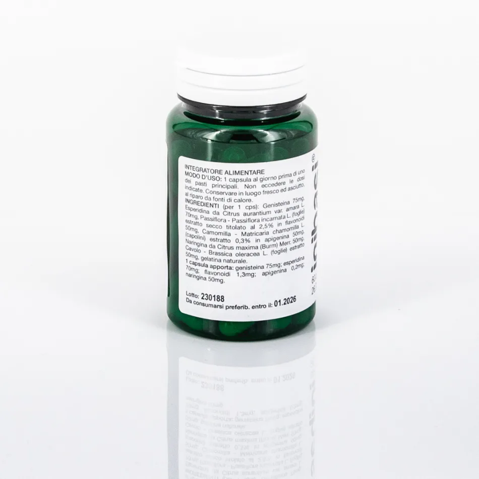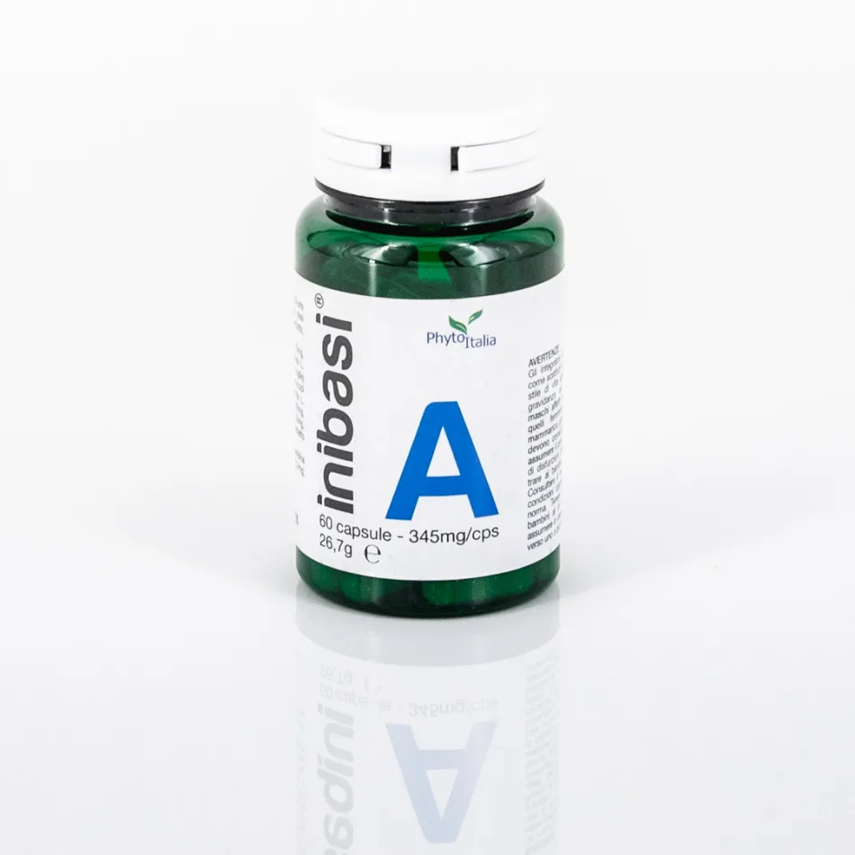 INIBASI A® (per 1 cps): Genisteina 75 mg, Esperidina da Arancio Amaro - Citrus aurantium 70 mg, Naringina da Pomelo - Citrus grandis 0.50 mg, Camomilla - Matricaria chamomilla L. ( capolini) estratto titolato allo 0,3% in Apigenina 50 mg, Passiflora - Passiflora incarnata L. ( foglie) 50 mg, Cavolo - Brassica oleracea var. capitata L. (foglie) estratto 50 mg, gelatina naturale