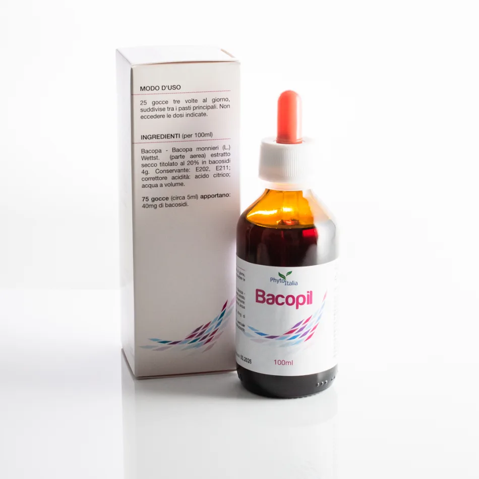 BACOPIL INGREDIENTI (per 100ml): Bacopa - Bacopa monnieri (L) Pennel (sommità) estratto secco titolato al 20% in bacosidi 4g, conservante: potassio sorbato, acqua a volume, E202, E211 correttore acidità: acido citrico 75 GOCCE (circa 5ml) APPORTANO: 4mg di bacosidi