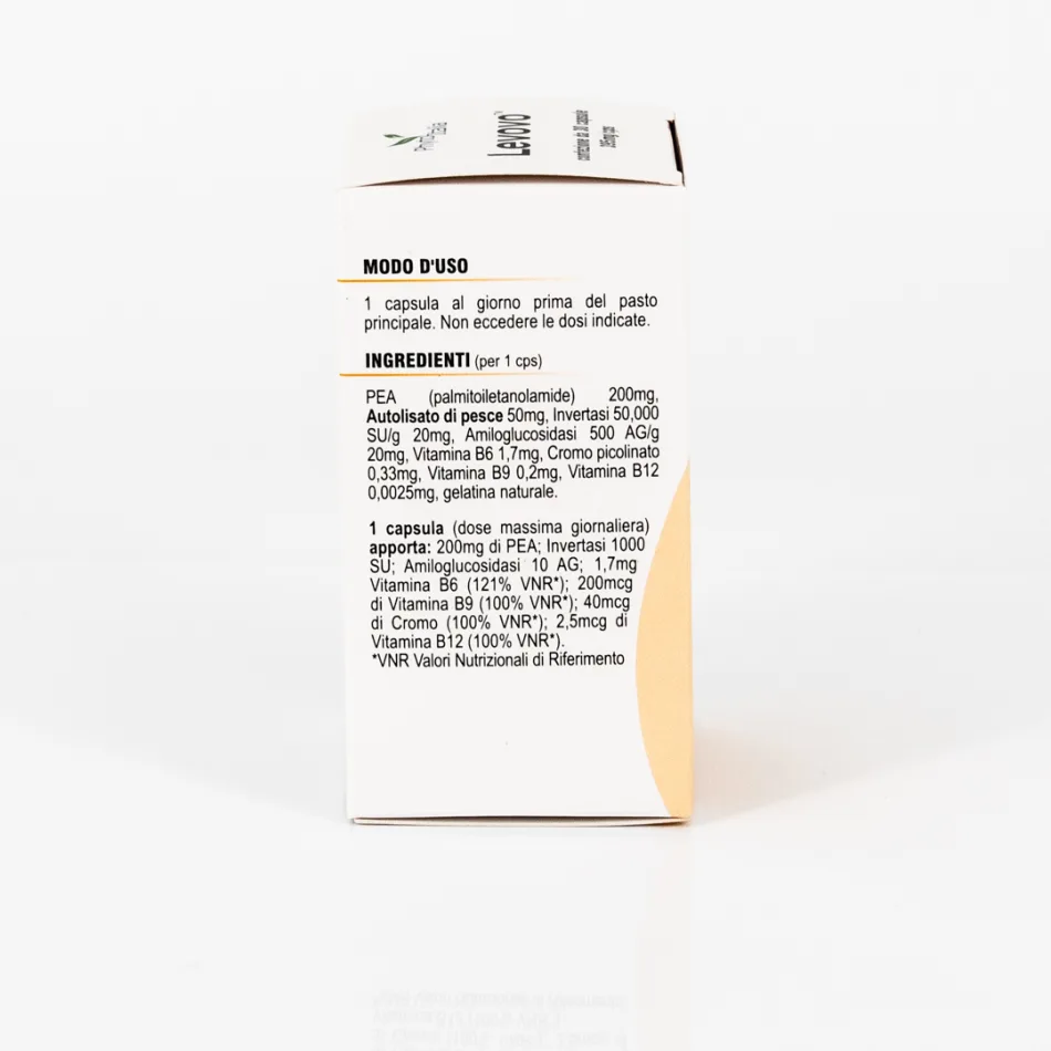 LEVOVO (per 1 caps): PEA (palmitoiletanolamide) 200mg, Autolisato di pesce 50mg, Invertasi 50,000 SU/g 20mg, Amiloglucosidasi 500 AG/g 20mg, Vitamina B6 1,7mg, Cromo picolinato 0,33mg, Vitamina B9 0,2mg, Vitamina B12 0,0025mg, gelatina naturale.