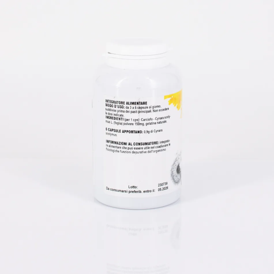 CARCIOFO (per 1 cps): Carciofo - Cynara scolymus L. (foglia) polvere 150mg, gelatina naturale. 6 CAPSULE APPORTANO: 0,9g di Cynara scolymus L.