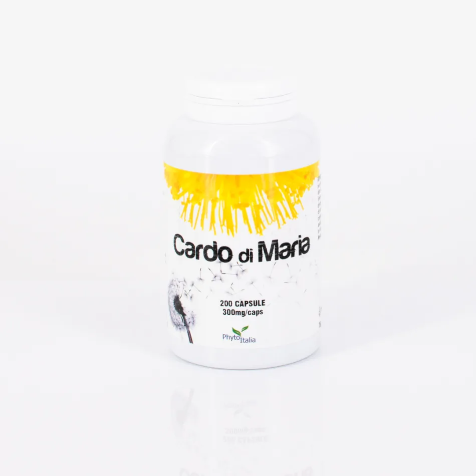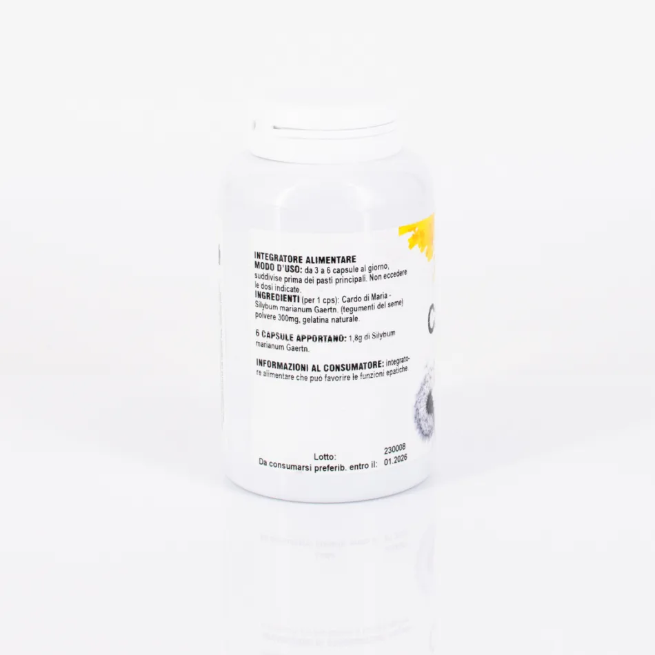 CARDO DI MARIA (per 1 cps): Cardo di Maria - Silybum marianum Gaertn. (tegumenti del seme) polvere 300mg, gelatina naturale 6 CAPSULE APPORTANO: 1,8g di Silybum marianum Gaertn.