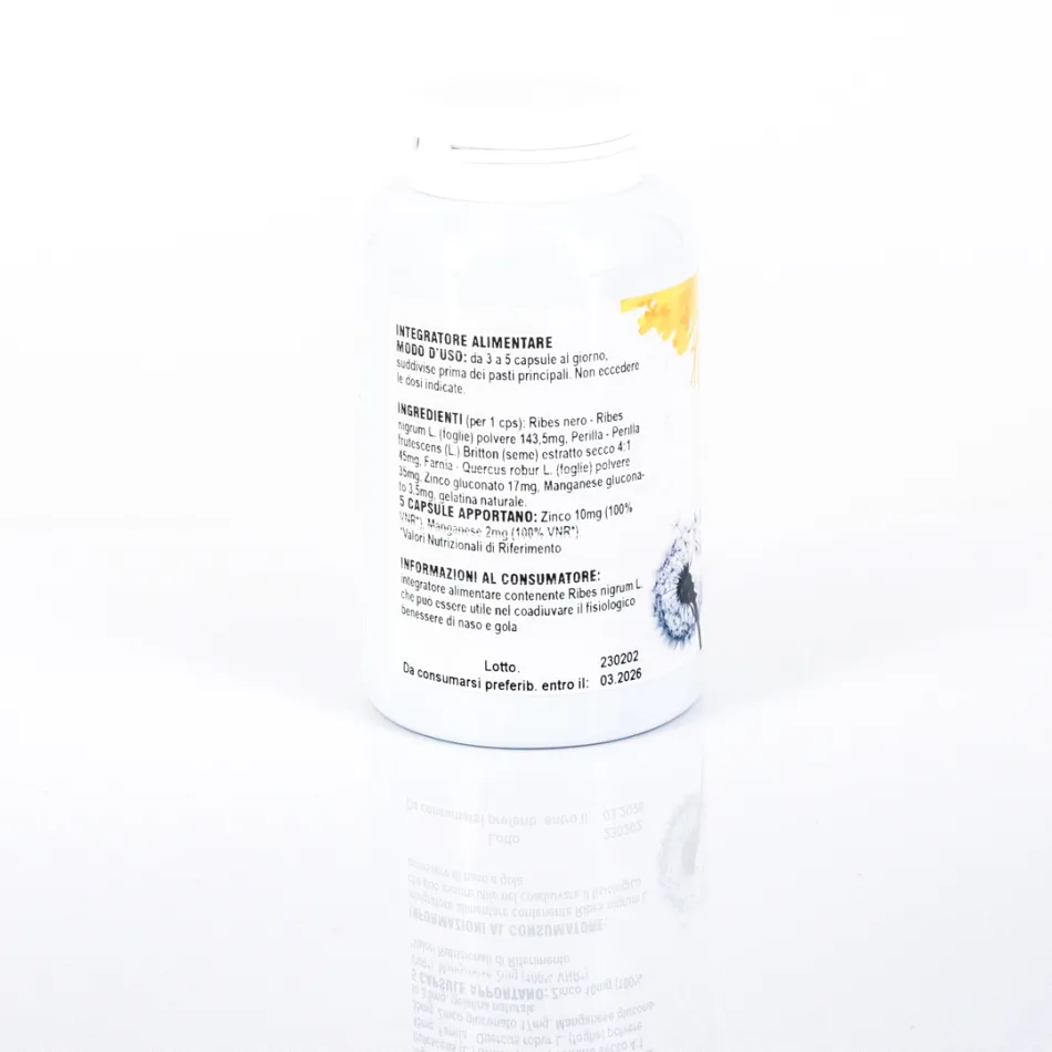 Integratore alimentare contenente Ribes nigrum L. che può essere utile nel coadiuvare il fisiologico benessere di naso e gola.