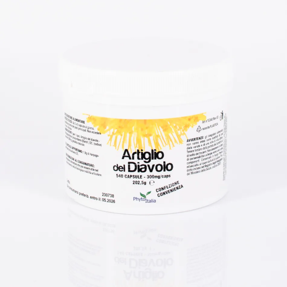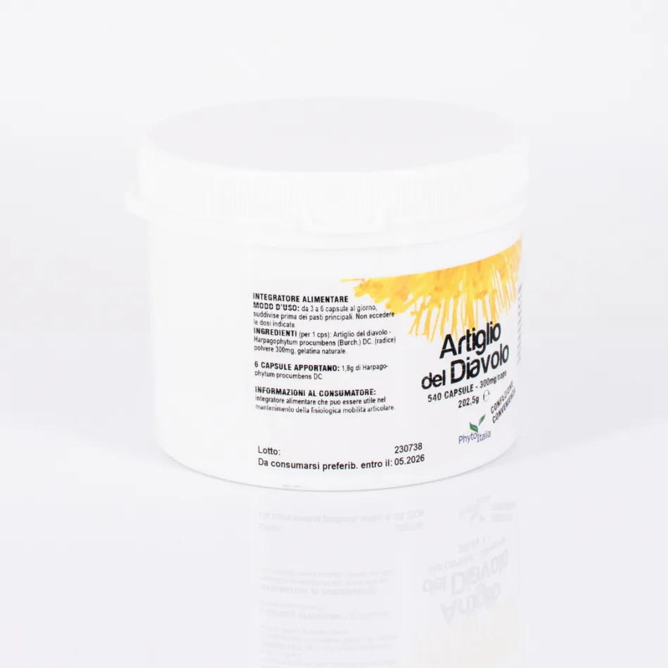 ARTIGLIO DEL DIAVOLO (per 1 cps): Artiglio del Diavolo - Harpagophytum procumbens DC. (radice) polvere 300mg, gelatina naturale. 6 CAPSULE APPORTANO: 1,8g di Harpagophytum procumbens DC.