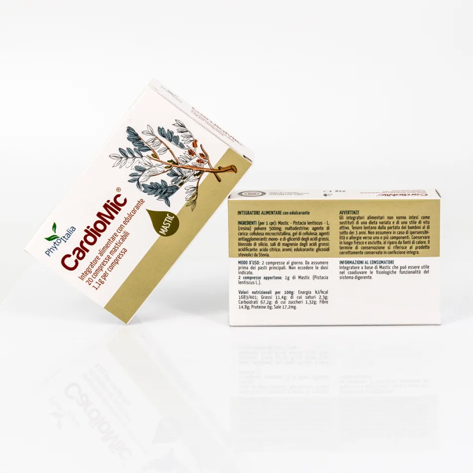 CARDIOMIC (per 1 cpr): Mastic - Pistacia lentiscus L. (resina) polvere 500mg; maltodestrine; agente di carica: cellulosa microcristallina; agenti antiagglomeranti: mono- e di-gliceridi degli acidi grassi, biossido di silicio, sali di magnesio degli acidi grassi; acidificante: acido citrico; aromi; edulcorante: glicosidi dello steviolo