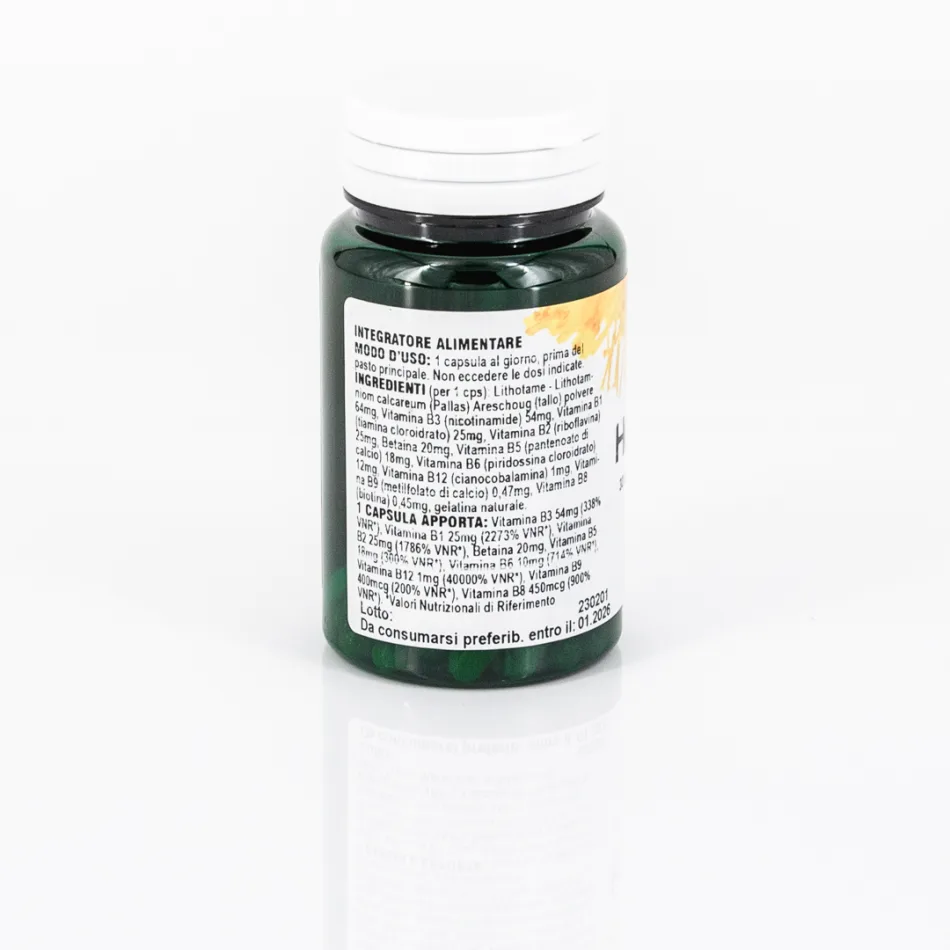 1 CAPSULA APPORTA: Viamina B3 54 mg ( 338% VNR*), Vit.B1 25 mg (2273% VNR*), Vit.B2 25 mg (1786% VNR*) Betaina 20 mg, Vit B5 18 mg (300% VNR*), Vit.B6 10 mg (714% VNR*) Vit.B12 1 mg (40000% VNR*) Vit.B9 400 mcg (200%VNR*) Vit.B8 450 mcg (900%VNR*) *Valori Nutrizionali di Riferimento