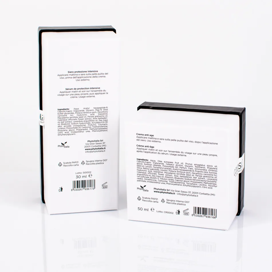 INCI Crema: Aqua, Olea europaea fruit oil, Prunus amygdalus dulcis oil, Caprylic/capric triglyceride, Cetearyl alcohol, Glycerin, Panthenol, Propylene glycol, Sorbitan stearate, Polysorbate 60, Parfum, Faex, Simmondsia chinensis seed oil, Lanolin, Tocopheryl acetate, Acetyl hexapeptide-8, Propolis cera, Sucrose, Silica, Retinyl palmitate, Inositol, Pistacia lentiscus gum, Decarboxy carnosine hci, Hyaluronic acid, Silanetriol, Macadamia ternifolia seed oil, Persea gratissima oil, Calendula o¬cinalis flower extract, Aloe barbadensis leaf extract, Lavandula angustifolia oil, Zea mays oil, Allantoin, Bisabolol, Sodium benzotriazolyl butylphenol sulfonate, Buteth-3, Tributyl citrate, Caprylyl glycol, Propanediol, Methylpropanediol, Dimethicone, Carbomer, Triethanolamine, Tocopherol, Lecithin, Ascorbyl palmitate, Imidazolidinyl urea, Phenoxyethanol, Ethylhexylglycerin, Citric acid. INCI del siero: Aqua, Acetyl hexapeptide-8, Caprylic/capric triglyceride, Glycerin, Peg-75 Shea butter glycerides, Pistacia lentiscus gum, Decarboxy carnosine hci, Hyaluronic acid, Silanetriol, Macadamia ternifolia seed oil, Persea gratissima oil, Calendula o¬cinalis flower extract, Aloe barbadensis leaf extract, Lavandula angustifolia oil, Zea mays oil, Bisabolol, Sodium hyaluronate, Acrylates/c10-30 alkyl acrylate crosspolymer, Profumo, Coumarin, Linalool, Polysorbate 20, Carbomer, Triethanolamine, Propylene glycol, Propanediol, Methylpropanediol, Citric acid, Imidazolidinyl urea, Phenoxyethanol, Ethylhexylglycerin.