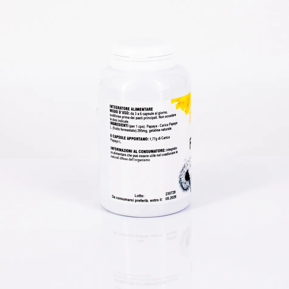 PAPAYA FERMENTATA (per 1 caps): Papaya - Carica Papaya L. (frutto fermentato) 295 mg, gelatina naturale.
