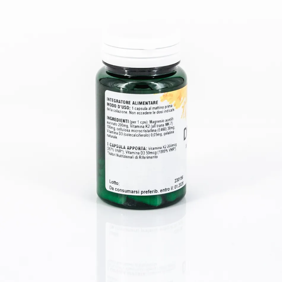 1 capsula apporta: Vitamina K2 200mcg (267% VNR*); Vitamina D3 50mcg (1000% VNR*).*Valori Nutrizionali di Riferimento