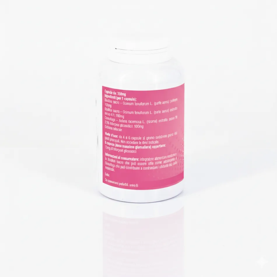 Integratore alimentare contenente Basilico sacro che può essere utile come adattogeno e Cimicifuga che può contribuire a contrastare i disturbi del ciclo mestruale.
