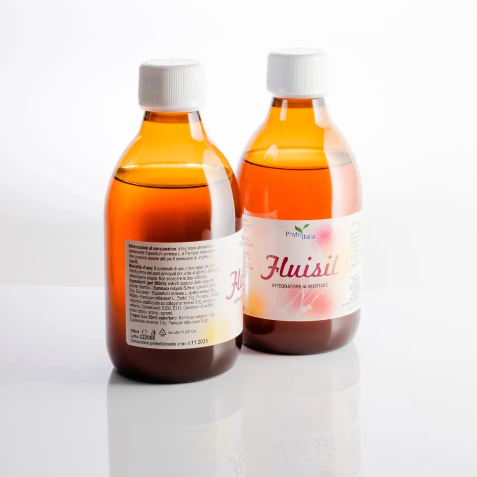 FLUISIL (per 300ml): Bambou - Bambusa vulgaris Schrad. (manna) 24g, Equiseto - Equisetum arvense L. (erba) 24g, Miglio - Panicum miliaceum L.(frutto) 12g, Silicio organico stabilizzato su collagene marino 0,6g, acqua a volume, conservanti: E202, E211; correttore di acidità: acido citrico; aroma: agrumi.