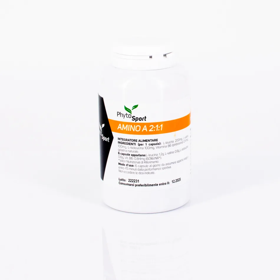 AMINO A 2:1:1 (per 1 capsula): L-leucina 200mg, L-valina 100mg, L-isoleucina   100mg, Vitamina B6 (piridossina), 0.14mg. Gelatina naturale
