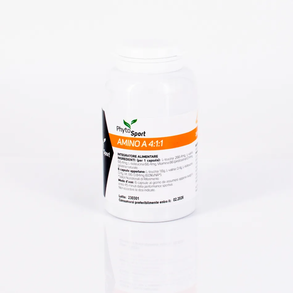 AMINO A 4:1:1I (per 1 capsula): L-leucina 266.4mg, L-valina 66.4mg, L-isoleucina 66.4mg, Vitamina B6 (piridossina) 0.14mg. Gelatina naturale
