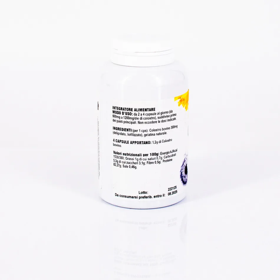 4 CAPSULE APPORTANO: 1,2g di Colostro bovino.