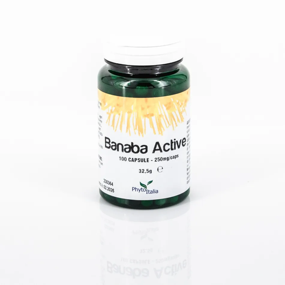BANABA ACTIVE (per 1 caps): Lagerstroemia - Lagerstroemia speciosa Pers. (foglie) polvere 150mg, Ampalaya - Momordica charantia L. (frutto) estratto 4:1 50mg, Lagerstroemia - Lagerstroemia speciosa Pers. (foglie) estratto titolato all'1% in acido corosolico 50mg, gelatina naturale.