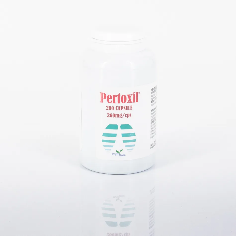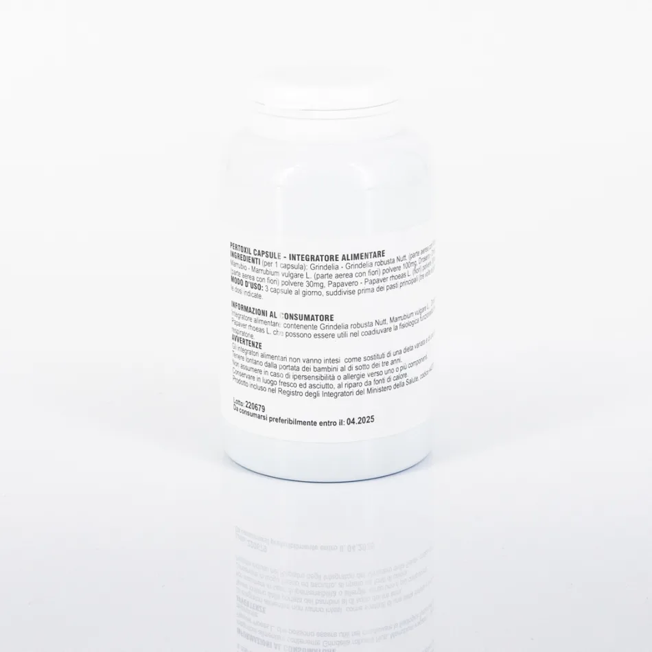 PERTOXIL (per 1 caps): Grindelia - Grindelia robusta Nutt. (erba con fiori) polvere 100mg, Marrubio - Marrubium vulgare L. (erba con fiori) polvere 100mg, Rosolida - Drosera rotundifolia L. (erba con fiori) polvere 30mg, Papavero - Papaver rhoeas L. (fiori) polvere 30mg, gelatina naturale.