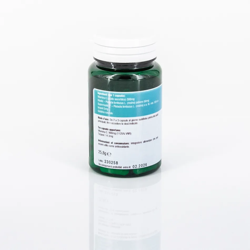 INGREDIENTI (per 1 capsula): Vitamina C (acido ascorbico) 300mg, Mastic – Pistacia lentiscus L. (resina) polvere 50mg, Supermastic™ – Pistacia lentiscus L. (resina) e.s. tit. min. 95% in terpeni 5mg, Gelatina naturale.